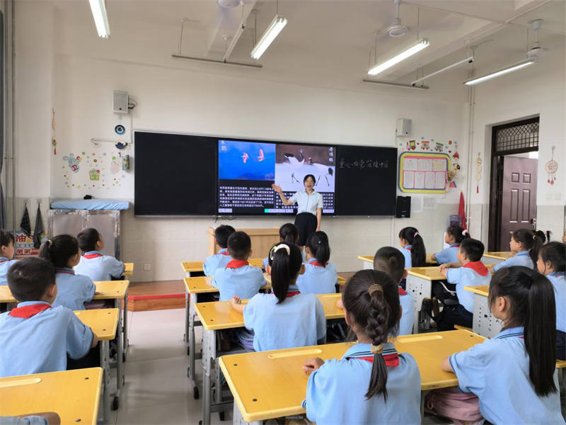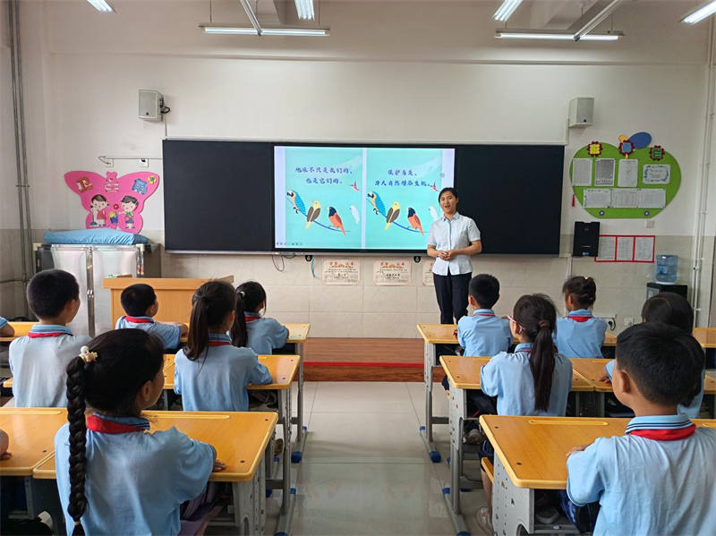 班会课上,班主任老师围绕“保护自然 和谐共生”主题,通过播放视频,引导同学们思考人类与自然的关系,进一步普及鸟类保护的重要性以及乱捕滥猎的危害,激发同学们保护生态环境的责任感。