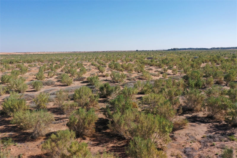 如今,从空中俯瞰阿拉善项目区,沙丘与沙丘之间的一个个坑洼都被绿色“填满”了,变成了一个个绿色网格,像一张巨大的绿网成功将连绵沙丘牢牢缚住,再也无法流动了。