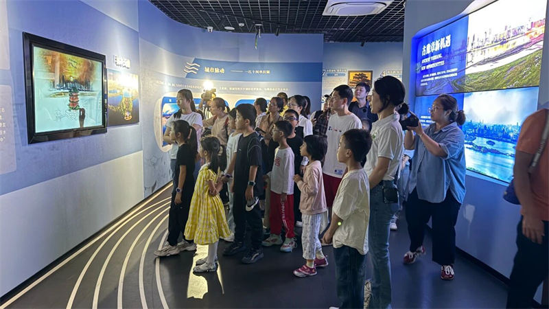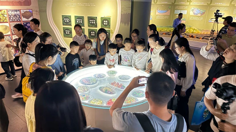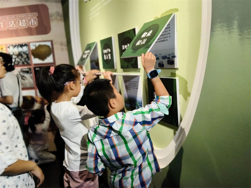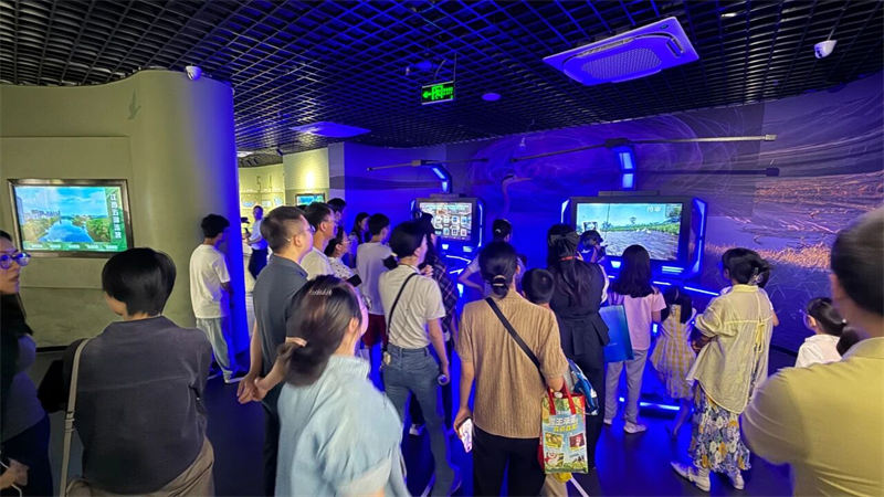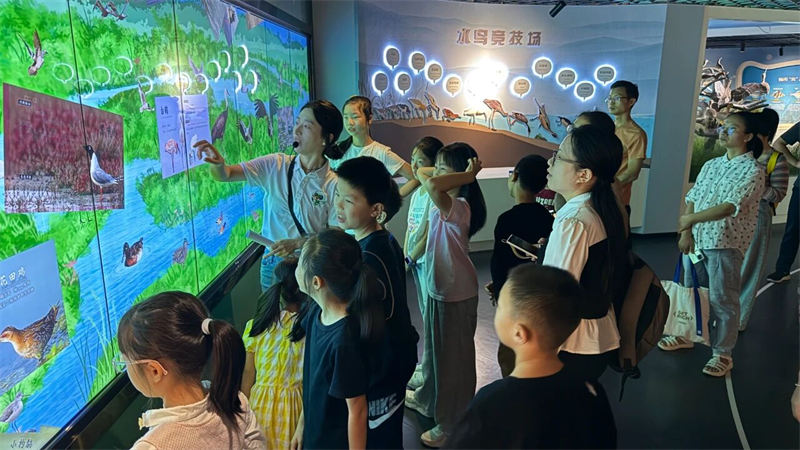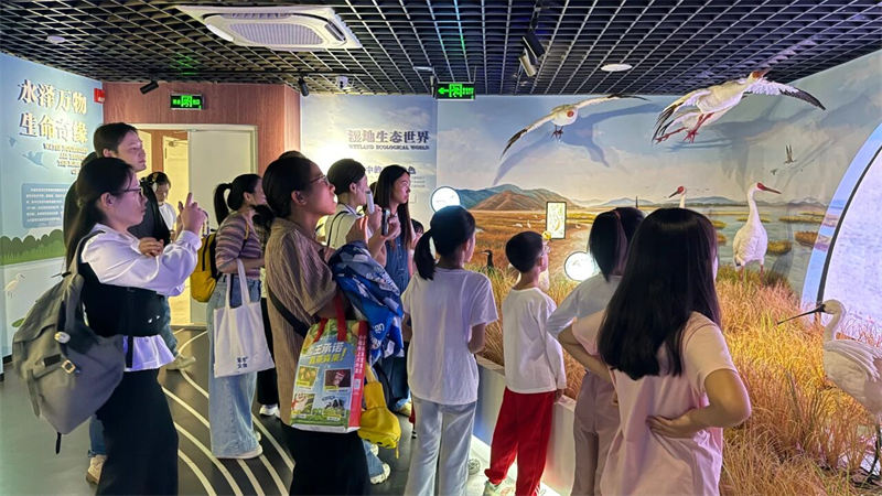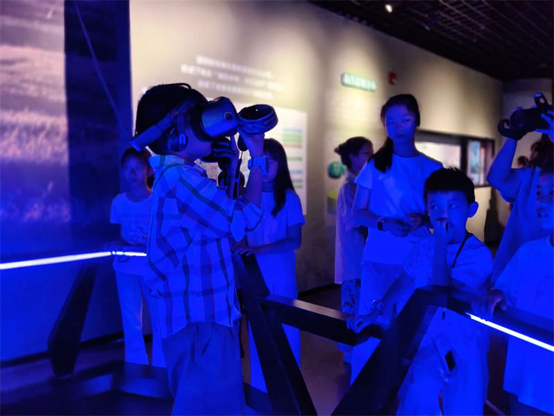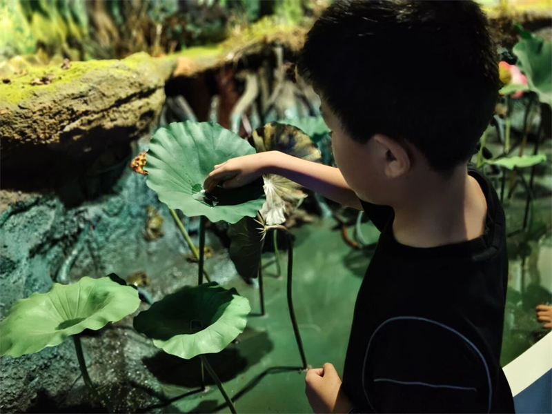 随后,大家走进了新近开放的南昌市湿地宣教馆。在“一江十河串百湖”的地理沙盘前,孩子们惊叹于家乡的湿地脉络;通过先进的VR设备,大家化身白鹤,翱翔于鄱阳湖的壮美上空;在水下生态模型前,鱼儿和水生昆虫的奥秘被一一揭晓。这座现代化展馆以其沉浸式的体验,为大家生动诠释了“南昌湿韵,源远流长”的主题。